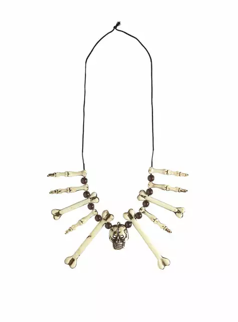 Completa tu disfraz y forma parte de la tribu con este collar de huesos y calavera troglodita.