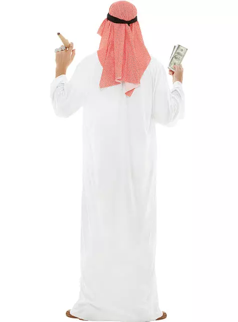 Este disfraz de jeque árabe incluye lo más característico de cualquier jeque, una gran túnica blanca y un pañuelo para la cabeza, de cuadros de color rojo y blanco. Puedes añadirle aparte una perilla o una barba e incluso un collar del dólar para distinguirte como uno de los poderosos y ricos jeques árabes.