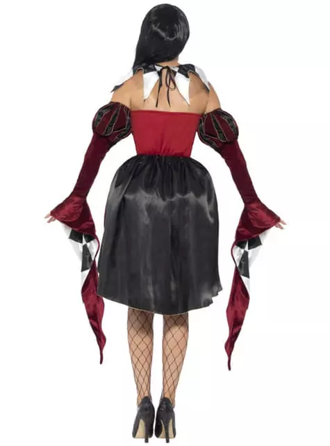 Este elegante disfraz de arlequín veneciana para mujer incluye un vestido de color negro, blanco y rojo con mangas y cuello adjuntos.