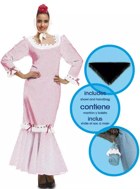 Incluye: vestido, pañuelo cabeza, bolsito y mantón