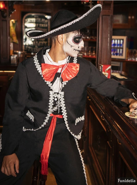 Este disfraz de mariachi está compuesto por una chaqueta negra con ribetes blancos y unos pantalones a juego de las mismas características. Como complementos, un fajín y una gran pajarita, ambos de color rojo. Todo ello crea un traje típico de mariachi con el que triunfarás en cualquier fiesta de disfraces. Y por supuesto… ¡qué viva México!