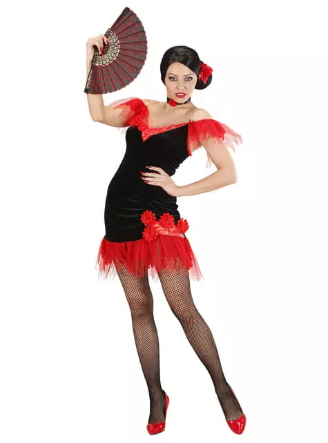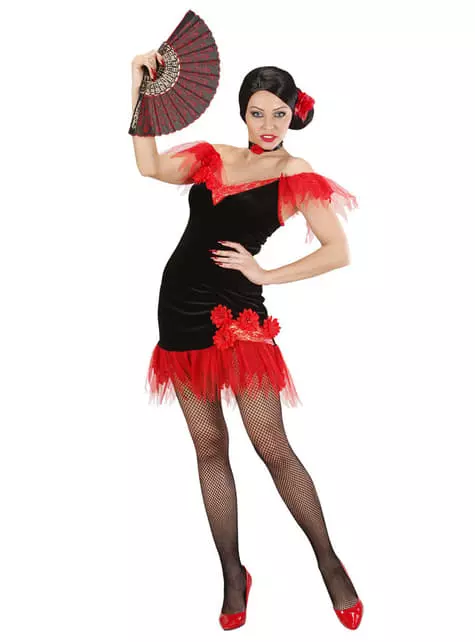 Representa toda la belleza ibérica con este disfraz de sevillana rojinegra para mujer.