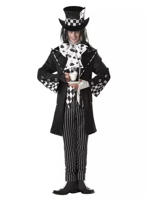 Este meticuloso disfraz de sombrerero loco incluye una chaqueta negra con botones y detalles blancos, un chaleco de cuadros y rayas negras y blancas, una pajarita blanca con sombreritos negros, un pantalón negro con líenas blancas, un gran sombrero negro con una carta y unos cubrebotas blancos y negros.