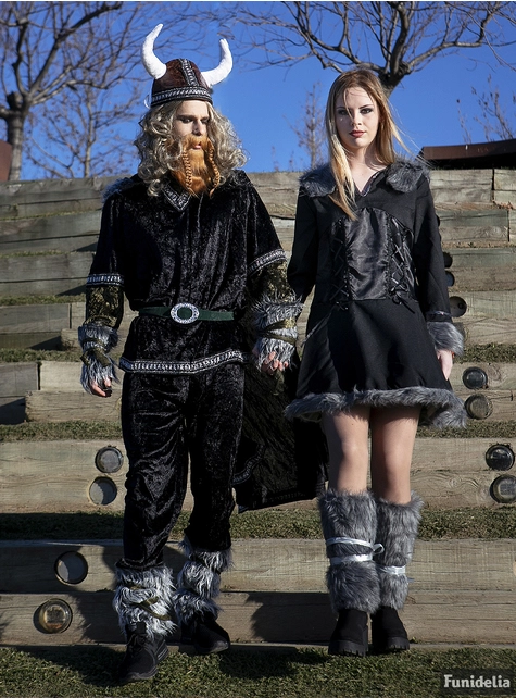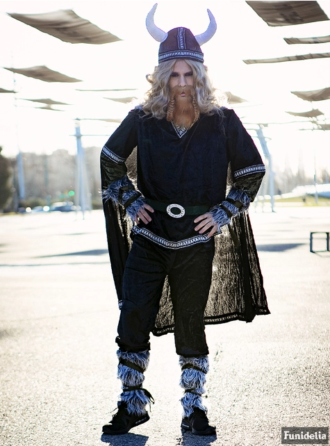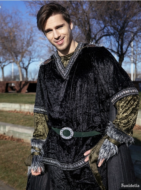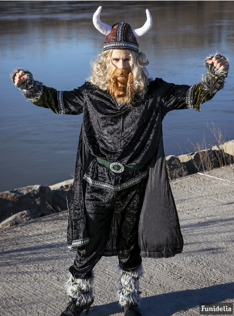 Incluye una camiseta negra con detalles blancos en los bordes, un pantalón negro y una capa negra, unos calentadores con pelo para los brazos y para las piernas y un casco marrón con cuernos blancos.