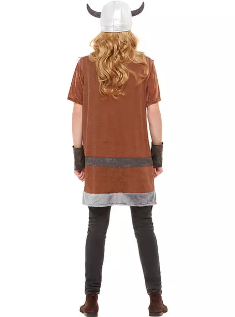 El traje de vikingo para hombre se compone de una túnica marrón y gris de manga corta, un look igual al que llevaban los vikingos. También incluye un caso plateado con dos pequeños cuernos en los laterales y el brazelete marrón, uno de los símbolos más importantes para identificar a los vikingos.