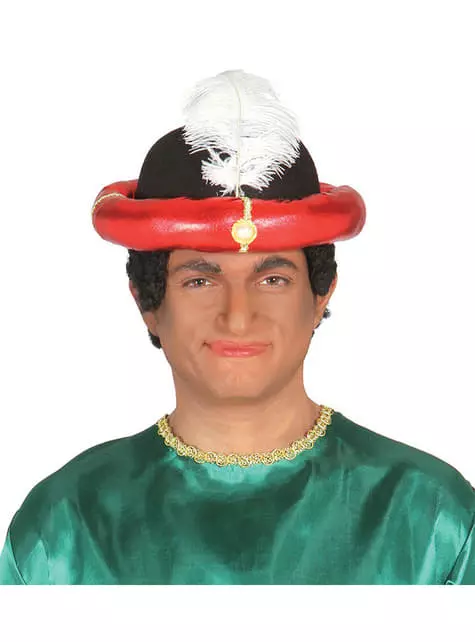 Incluye un gorro de marajá con la corona roja, un aplique tipo joya y una gran pluma blanca hacia arriba.