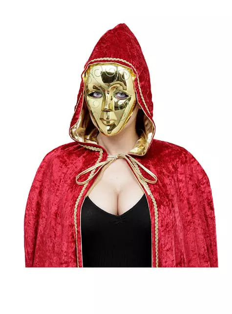 Incluye una máscara dorada que cubre la cara con detalles de purpurina verdes.