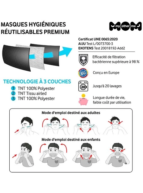 Incluye: 2 unidades con modelos diferentes de mascarilla higiénica reutilizable homologada con la normativa UNE 0065:2020.