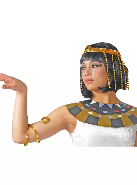 Incluye una diadema dorada con tiras colgantes y un brazalete dorado con la cabeza de una serpiente.